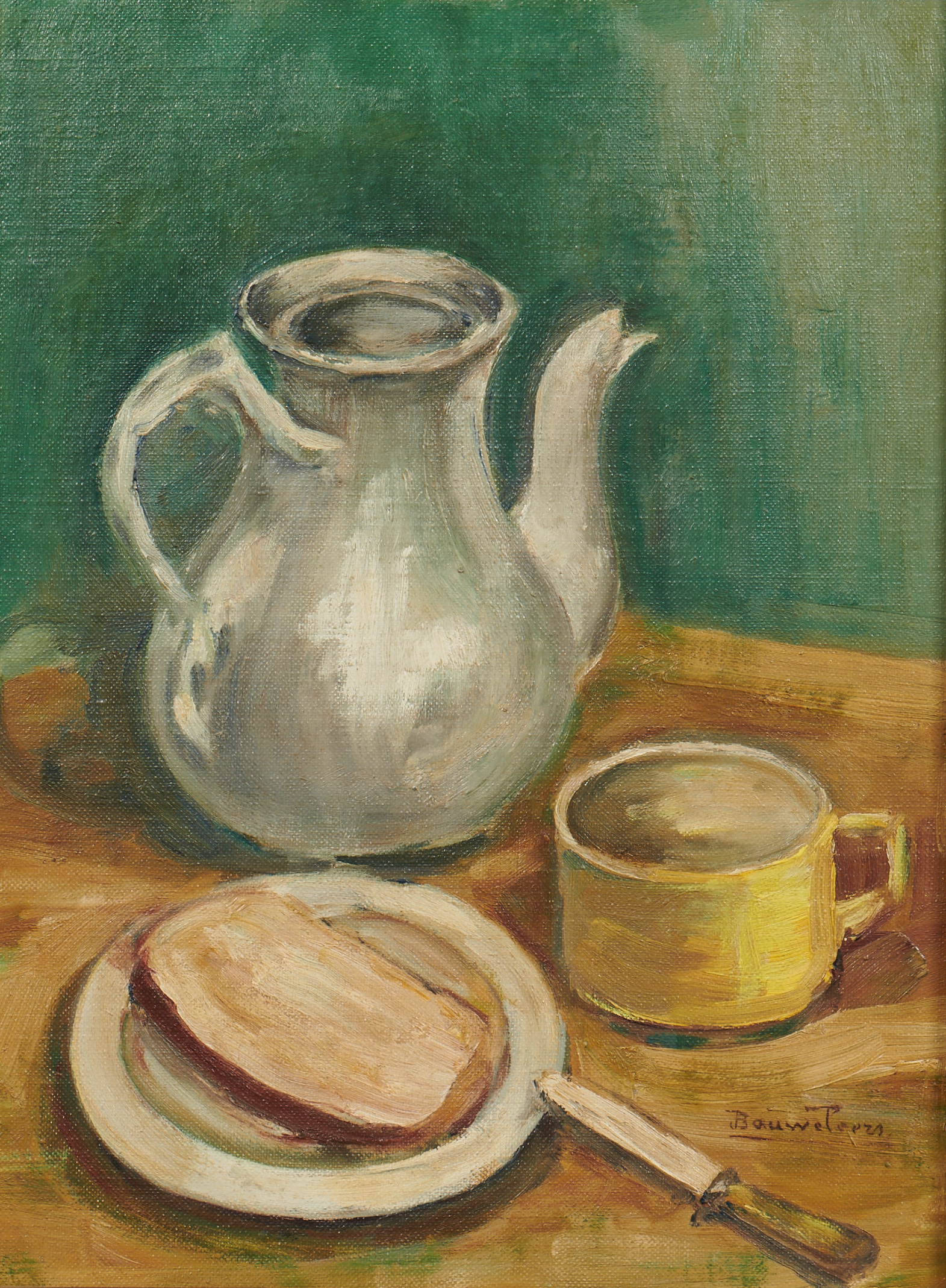Bouweleers | Stilleven met kan, bord en mok | € 75,-