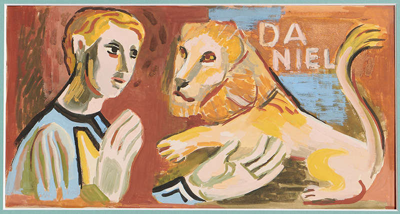 Kunstwerk | Een jongeman staat biddend of in aanbidding voor een leeuw. Het woord “DANIEL” is op de achtergrond geschreven. Dit beeld verwijst naar het bijbelverhaal van Daniël in de leeuwenkuil (Daniël 6). Daniël werd in de leeuwenkuil gegooid maar werd beschermd door God, waardoor de leeuwen hem niets aandeden. De leeuw hier is vredig, wat de bescherming door God symboliseert.